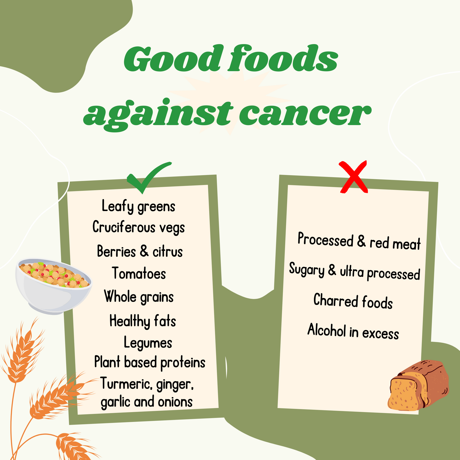 A balanced diet should include antioxidant-rich foods like berries, citrus fruits; cruciferous vegetables such as cauliflower, broccoli and brussels sprouts; leafy greens; whole grains and fibre; healthy fats like olive oil, nuts and seeds; and anti-inflammatory spices.