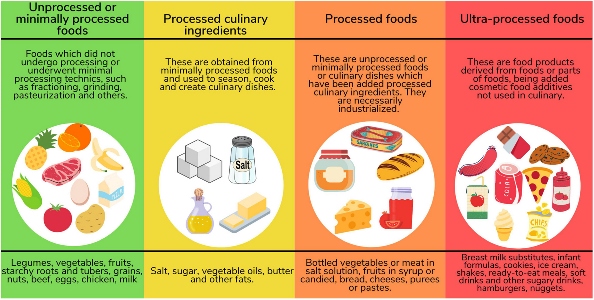 According to the number of processes involved in its manufacturing, food can be divided into four types, ultra-processed; processed; unprocessed or minimally processed; and processed culinary ingredients.